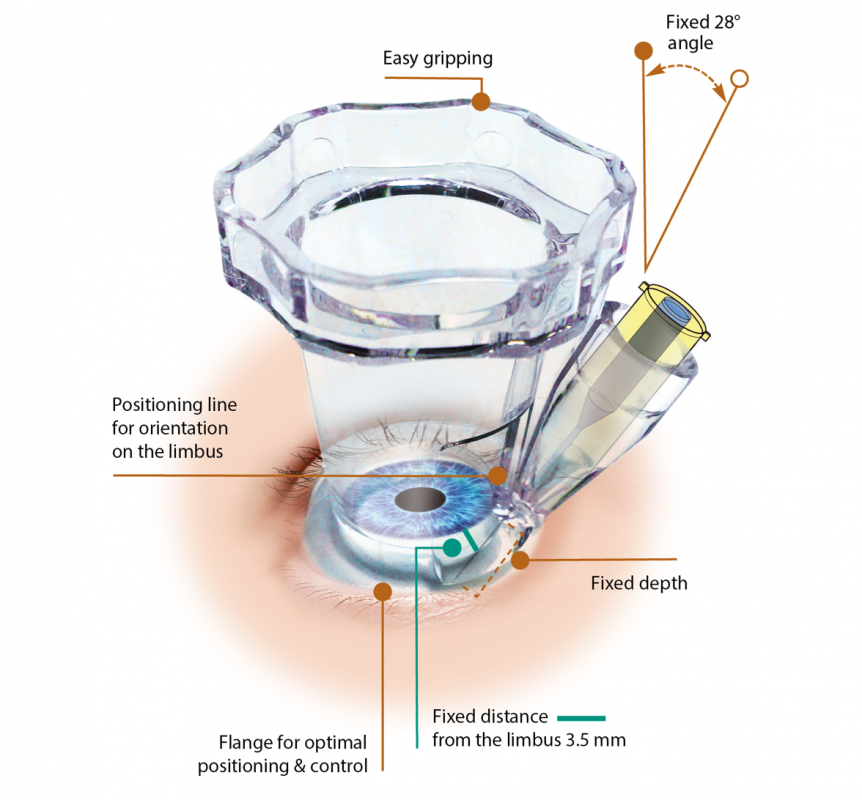 Precivia®, from FCI, simplifies intravitreal injections by making the procedure faster and more predictable. Its unique design presents a guide tube accurately oriented to ensure a fixed injection angle of 28°, a fixed distance at 3.5 mm from the limbus, and a fixed 5.60 mm depth.